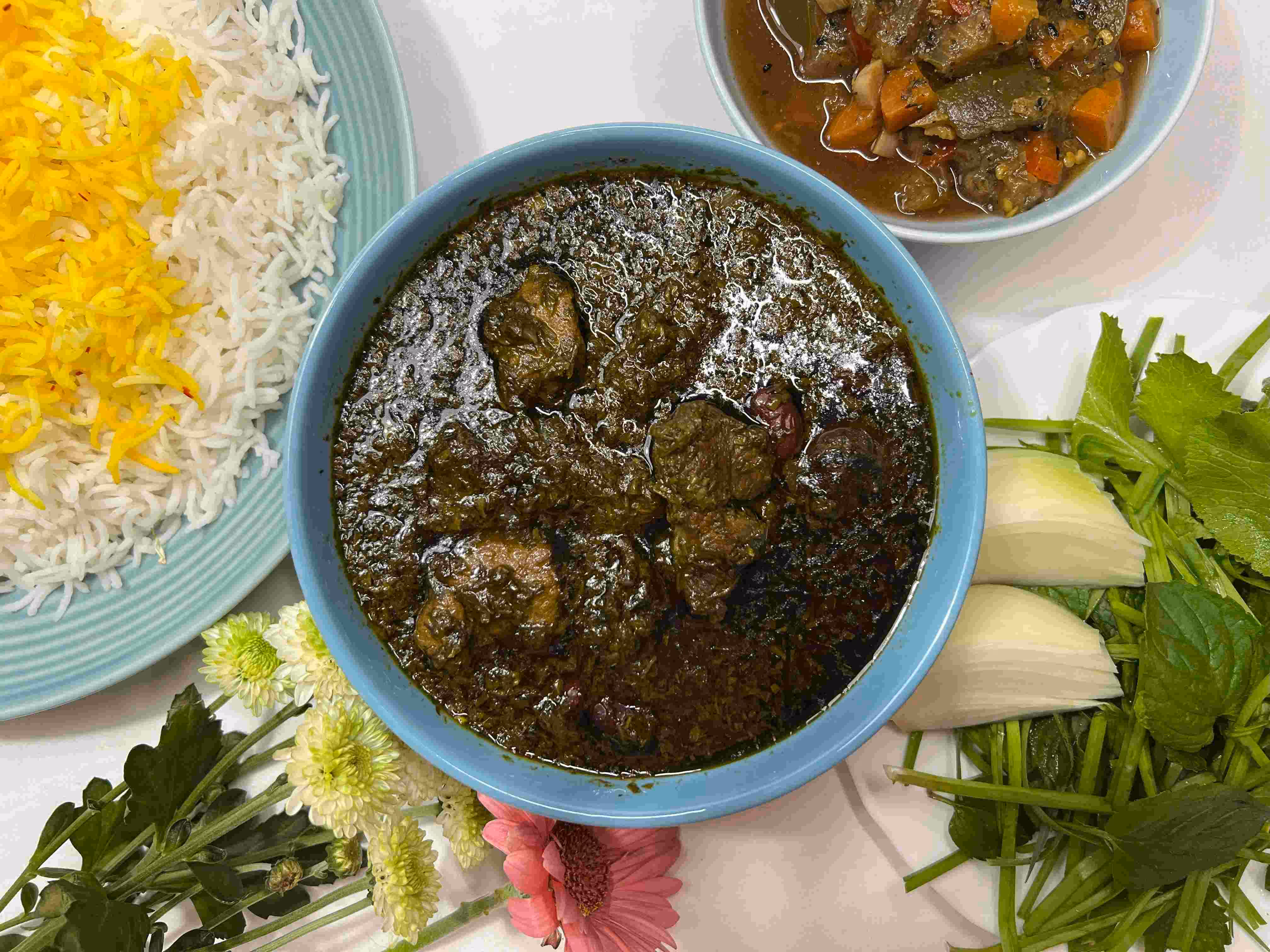 خورشتی که بهآرامی پخته شده از گوشت گوسفند، سبزیجات تازه، لوبیا قرمز و لیموعمانی. همراه با برنج.