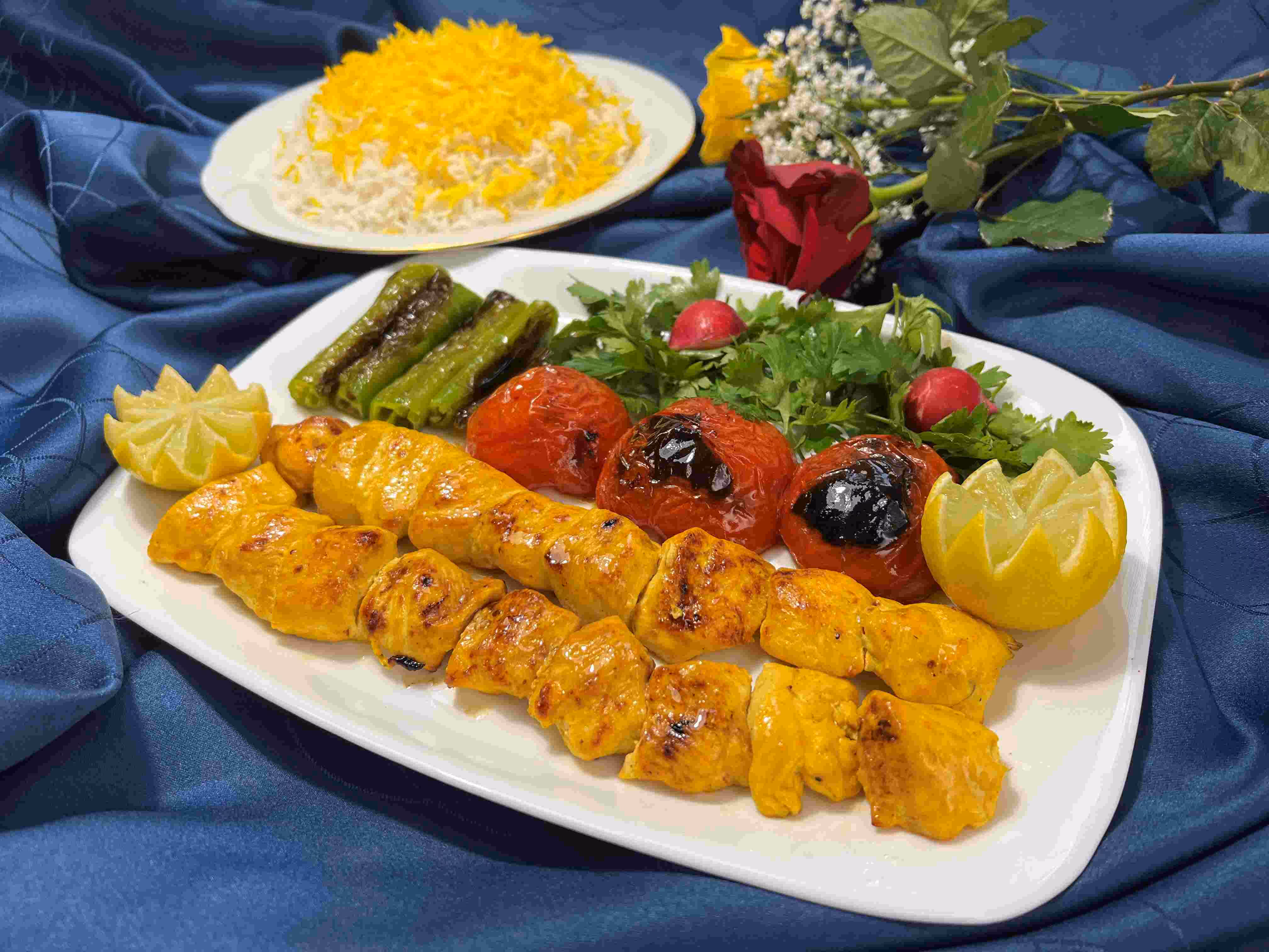 فیله ران مرغ مزهدار شده با زعفران، کبابشده روی ذغال، همراه با گوجهفرنگی و فلفل سبز سرو میشود همراه با برنج زعفرانی.