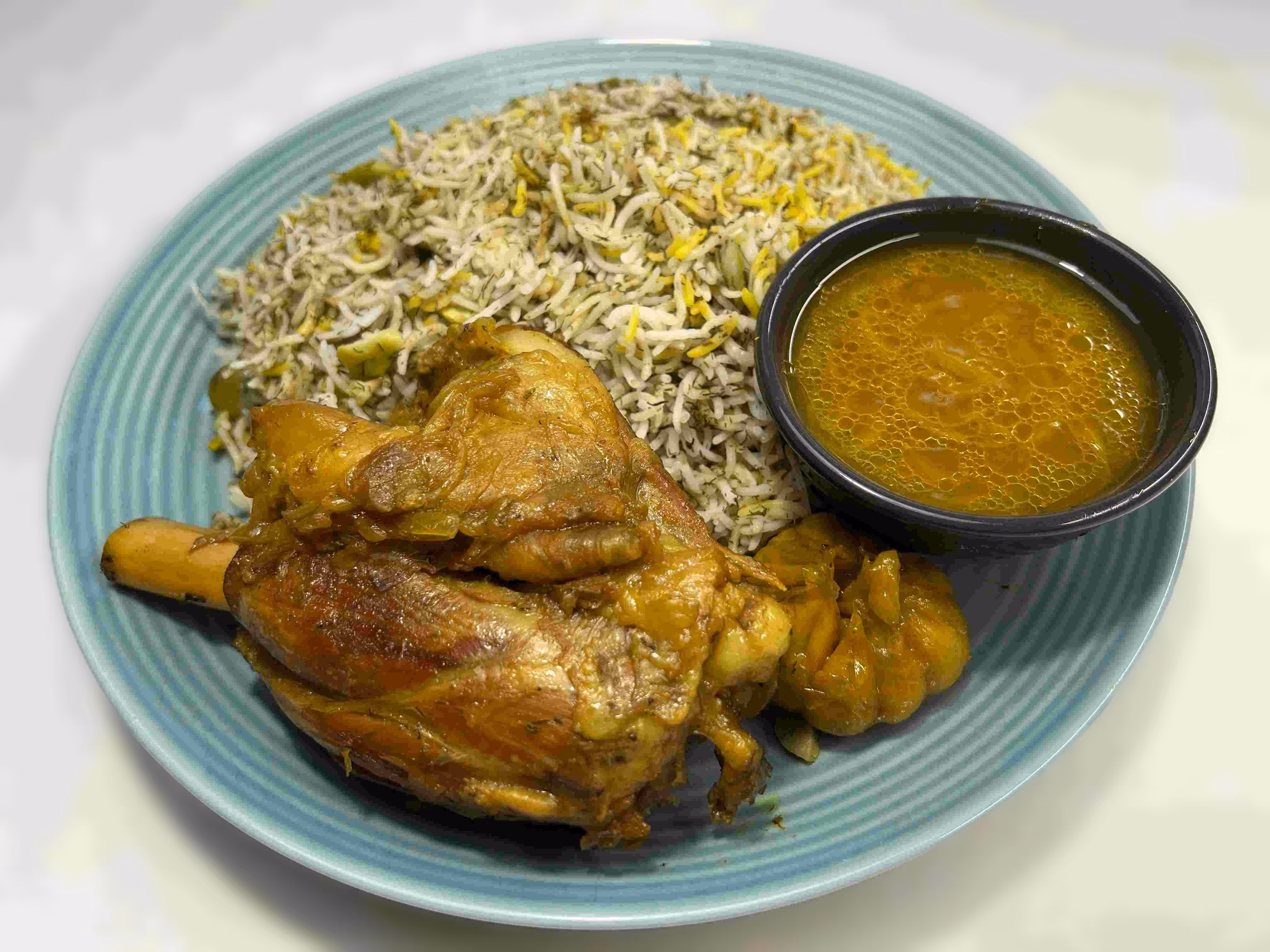 ران مرغ پخته و سرخ شده در سس زعفرانی همراه با برنج زعفرانی و زرشک
