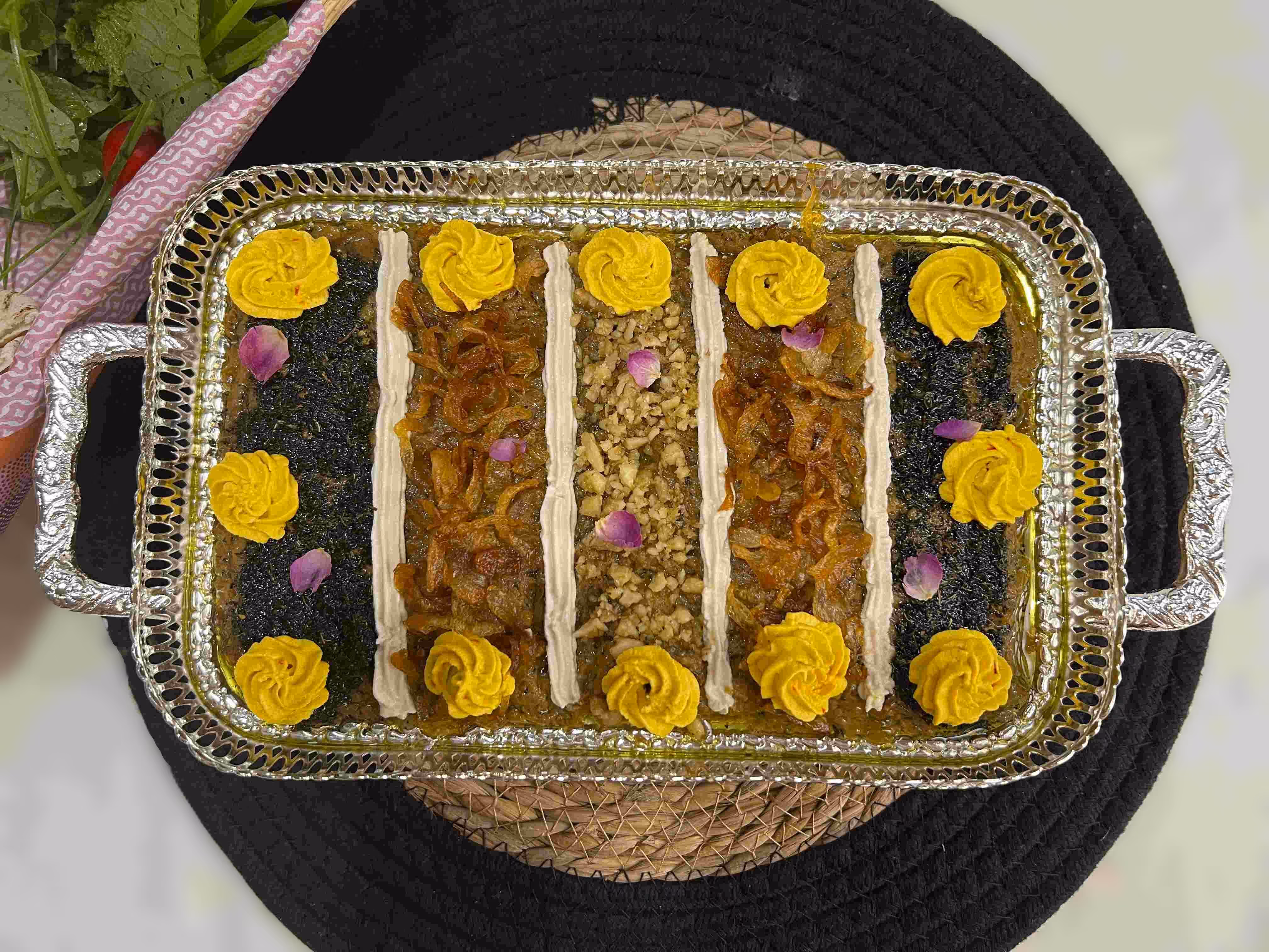 بادمجا ن سرخ شده با گوشت گوسفند، لپه و سس گوجهفرنگی همراه با برج