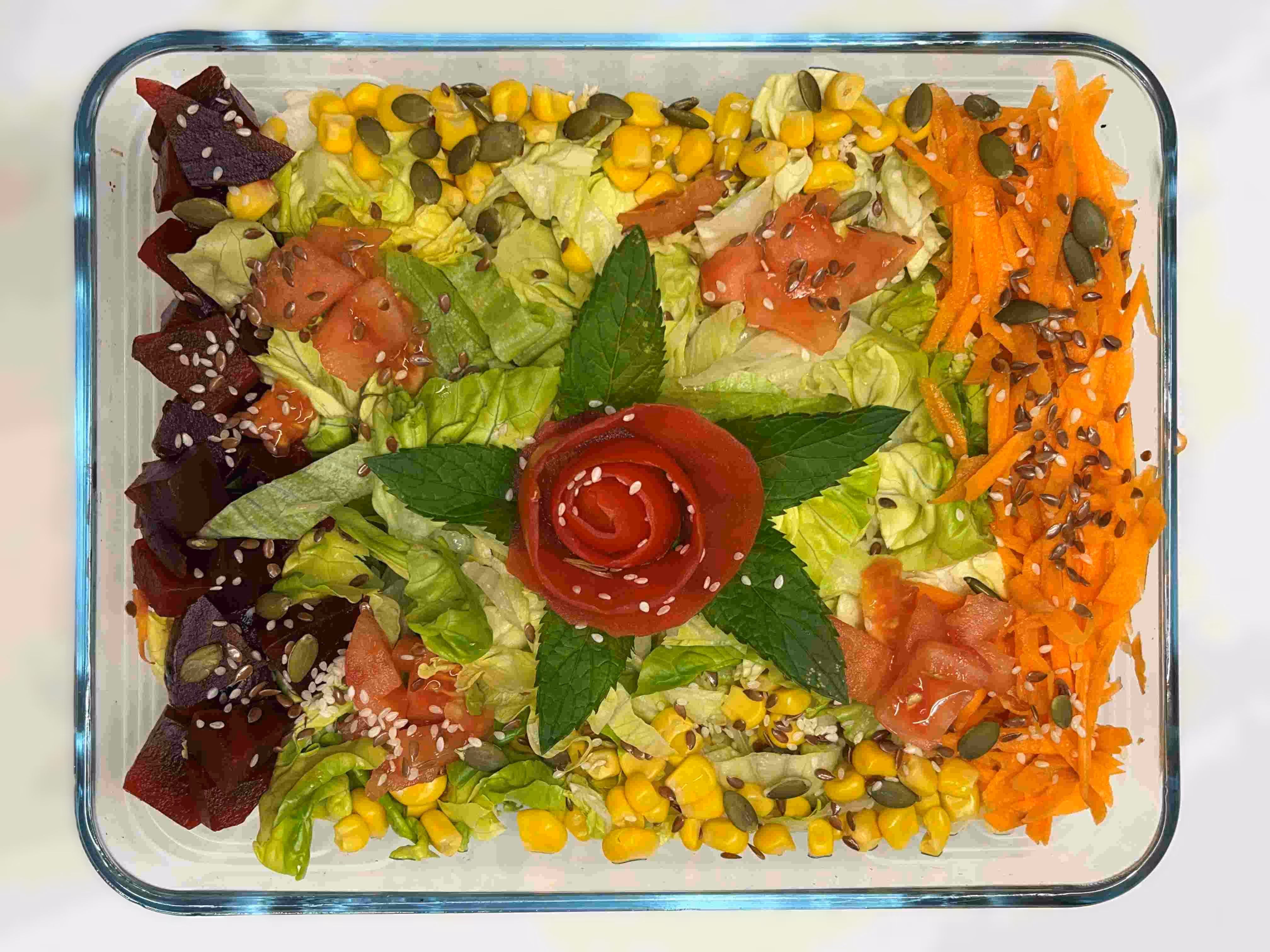 سالادی با پایه کاهو که بهصورت استاندارد با هویج رندهشده، گوجهفرنگی و ذرت سرو میشود.