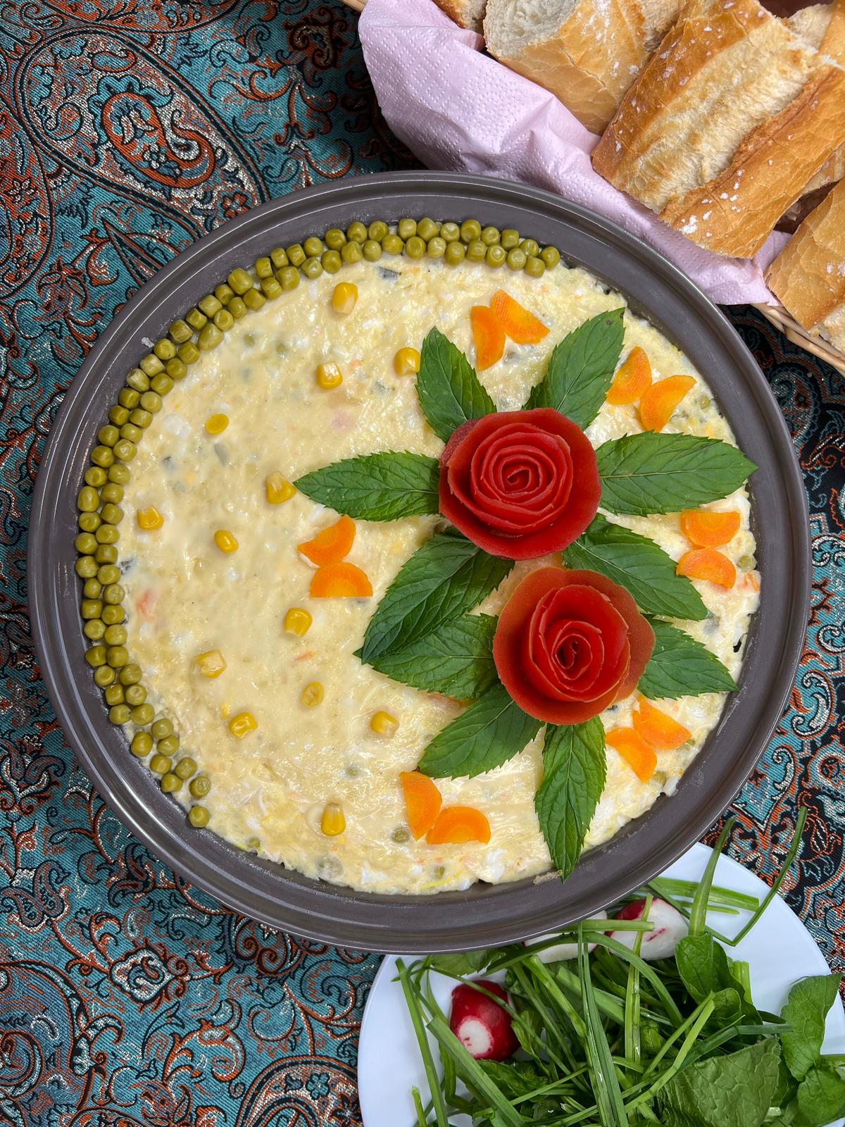 سیب زمینی ٫مرغ ٫ تخم مرغ ٫ نخود سبز پخته شده همراه با خیار شور و سس مایونز
